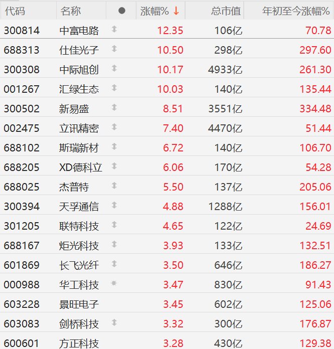 A股市场CPO概念股继续走强,截至半日收盘,中富电路涨超12%,仕佳光子、中际旭创涨超10%,汇绿生态10CM涨停,新易盛涨超8%,立讯精密涨超7%,斯瑞新材、德科立涨超6%,杰普特涨超5%。消息面上,兴证通信产业链调研显示,1.6T光模块需求持续上调。海外大客户近期上修2026年1.6T光模块采购计划,部分客户提前锁定明年产能,行业总需求预计从1000万上修到1500万,再到近期的2000万只,主要系GB300与后续Rubin平台加速部署,AI训练与推理网络带宽需求快速增长,1.6T产品进入量产放量。