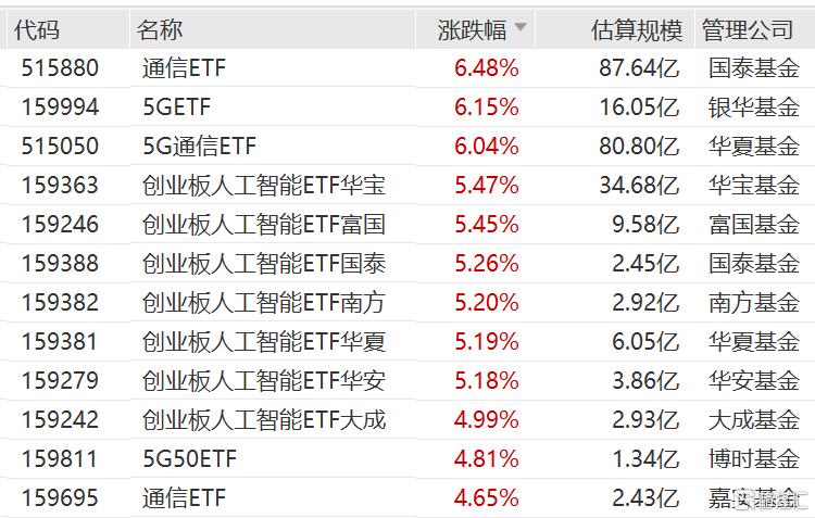通信ETF、5GETF、5G通信ETF涨超6%;创业板人工智能ETF华宝、创业板人工智能ETF南方、创业板人工智能ETF华夏、创业板人工智能ETF富国涨超5%。