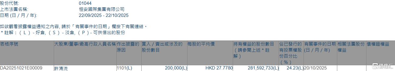 格隆汇10月22日丨据联交所最新权益披露资料显示,2025年10月20日,恒安国际(01044.HK)获执行董事许清流在场内以每股均价27.778港元增持20万股,涉资约555.56万港元。