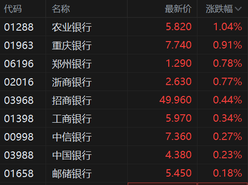 港股内银股继续上涨行情,其中,农业银行涨超1%再创历史新高,并且录得10连阳行情,重庆银行、浙商银行、郑州银行、招商银行、工商银行、中信银行、中国银行均有涨幅。