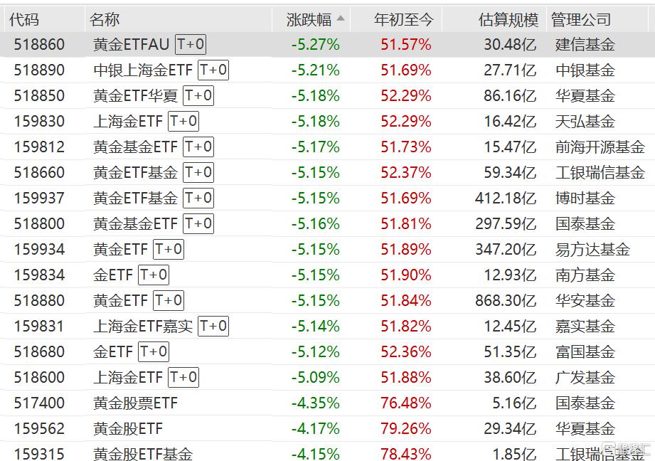 今日A股黄金主题ETF跟跌,黄金ETFAU、黄金基金ETF、上海金ETF跌超5%,黄金股票ETF跌超4%。