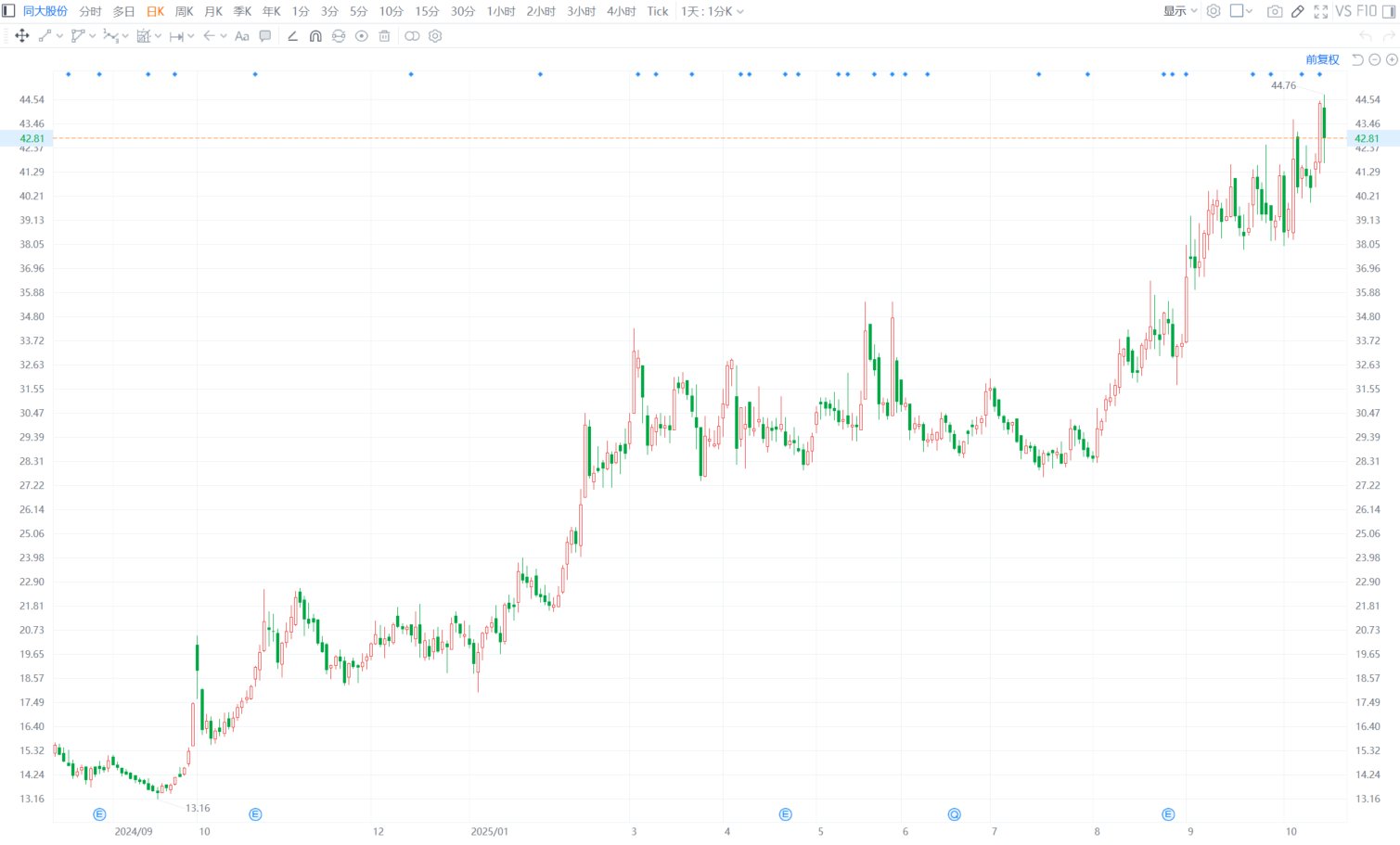 同大股份(300321.SZ)今日盘中一度跌5.98%至41.7元,年内股价仍累涨超1倍。同大股份公告,董事徐彦峰因个人资金需求,计划自公告披露之日起15个交易日后的3个月内,即2025年11月12日至2025年2月11日期间,通过集中竞价方式减持不超1600股,占0.0018%。减持价格将根据届时市场价格确定,减持数量遇除权除息事项将相应调整。(格隆汇)