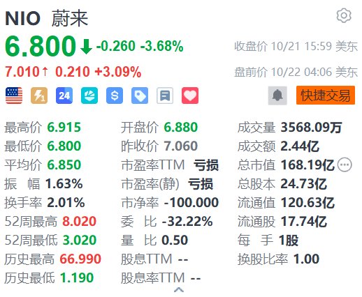 蔚来(NIO,US)盘前涨3.09%报7.01美元。消息面上,蔚来公司上周交付破万,其中蔚来超4K、乐道超5K、萤火虫超1.5K,其中L90单周交付突破3500台,创历史新高,产能较上月提升50%,ES8也正式进入上量阶段。据了解,乐道L90本周有很大可能累计交付突破3万台,蔚来全新ES8明年一季度产能已经排满。(格隆汇)
