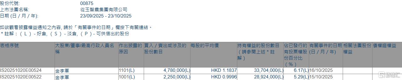 格隆汇10月23日丨根据联交所最新权益披露资料显示,2025年10月15日-10月16日,从玉智农(00875.HK)获股东金李军在场内以每股均价0.9996-1.1837港元合计增持703万股,涉资约790.72万港元。