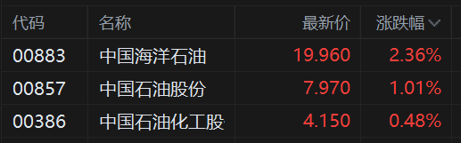港股三桶油盘初逆势上涨,中国海洋石油涨超3%,中国石油股份涨超1%,中国石油化工跟涨。