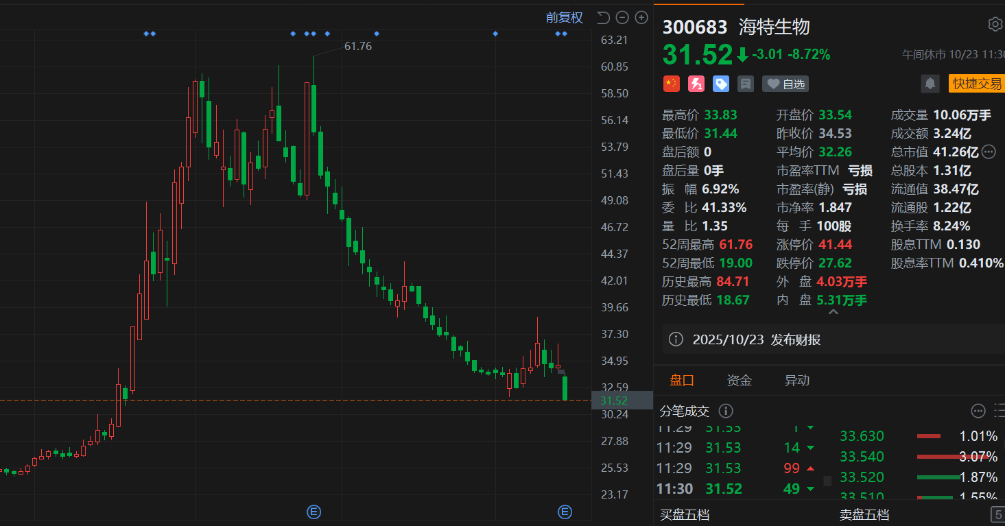 海特生物(300683.SZ)午间大幅收跌8.72%,报31.5元刷新阶段新低,自8月底调整以来累计跌幅超46%,目前市值为41.26亿元。