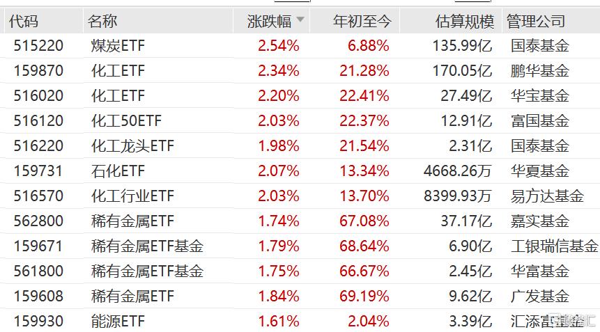 煤炭、化工、能源板块逆市走强,煤炭ETF、化工ETF、化工龙头ETF、石化ETF、化工50ETF、化工行业ETF涨超2%;稀有金属ETF、能源ETF涨超1.5%。