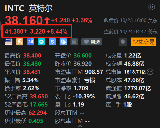 美国芯片制造商英特尔(INTC.US)盘前大幅上涨8.44%,报41.38美元。