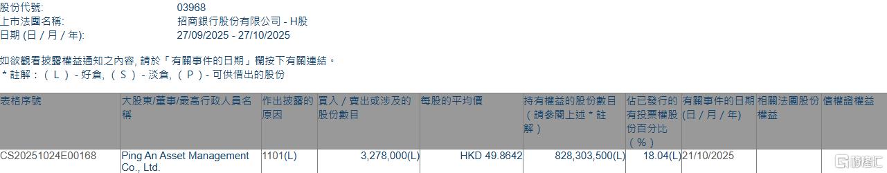 格隆汇10月27日丨根据联交所最新权益披露资料显示,2025年10月21日,招商银行(03968.HK)获Ping An Asset Management Co., Ltd.在场内以每股均价49.8642港元增持327.8万股,涉资约1.63亿港元。
