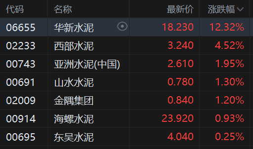 港股水泥股拉升明显,其中,华新水泥绩后大涨超12%领衔,西部水泥涨4.5%,亚洲水泥涨2%,山水水泥、金隅集团涨超1%,海螺水泥、东吴水泥跟涨。
