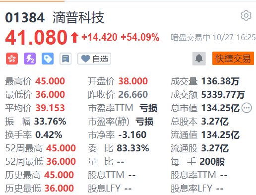 滴普科技(1384.HK)明日挂牌上市,在目前的暗盘交易中股价大涨。富途行情显示,滴普科技在目前的暗盘交易中涨超50%,报41.08港元。此前有数据显示,滴普科技香港公开发售获逾7590倍认购。以初步数据计算,滴普科技的超购倍数已超越今年9月上市的大行科工(超购7557.4倍),成为香港历来超购王第二位,同时也是今年港股新股AI领域的超购王。