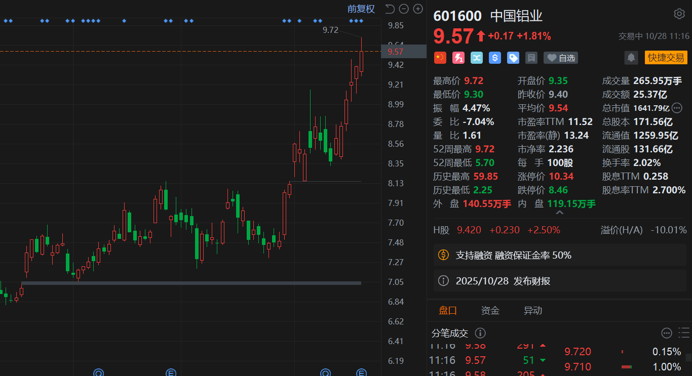 中国铝业AH股齐涨,其中,A股录得6连涨,H股连涨5日,且二者均刷新阶段新高价。
