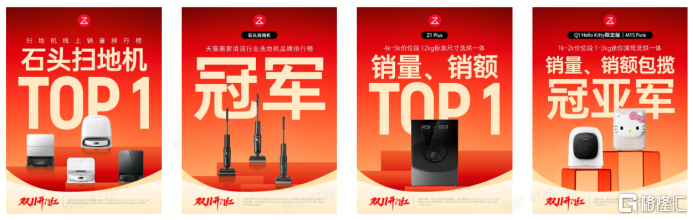 在海外市场取得亮眼成绩的同时,在国内市场也保持着积极的增长,并在近期的双十一大促中取得开门红的好成绩。石头全品类产品斩获多个榜单TOP1。