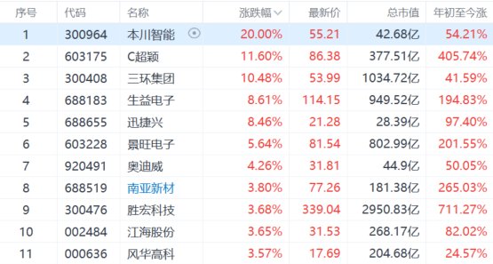 电子元器件板块走强,本川智能20cm涨停,淳中科技涨停,生益电子涨超8%,铜冠铜箔、富士达、可立克等纷纷走高。