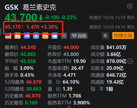 葛兰素史克(GSK.US)美股盘前涨3.36%。消息上,葛兰素史克周三表示,其在第三季度扭亏为盈,同时营业额较去年同比增长。截至9月30日的三个月内,归属于股东的利润为20.1亿英镑,而去年同期亏损5800万英镑。每股收益从亏损0.014英镑上升至0.491英镑。