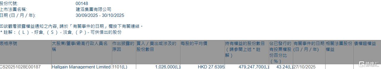 格隆汇10月30日丨根据联交所最新权益披露资料显示,2025年10月27日,建滔集团(00148.HK)获Hallgain Management Limited在场内以每股均价27.6395港元增持102.6万股,涉资约2835.81万港元。