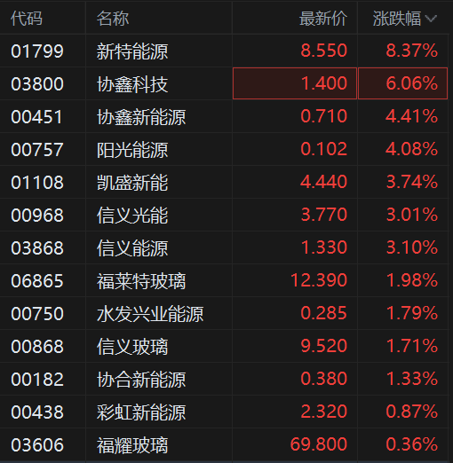 港股光伏股盘初拉升上涨,其中,新特能源涨超8%领衔,协鑫科技涨超6%,阳光能源、协鑫新能源涨超4%,凯盛新能涨3.7%,信义光能、信义能源涨超3%,福莱特玻璃、信义玻璃、福耀玻璃纷纷上涨。