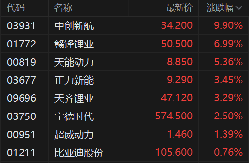 港股锂电池股拉升明显,其中,中创新航大涨10%领衔,赣锋锂业涨超7%,天能动力涨超5%,天齐锂业、正力新能涨超3%,宁德时代涨2.5%,超威动力涨1.3%。