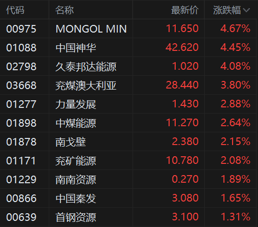 港股煤炭股普遍上涨,其中,中国神华盘初一度涨至6%,创下上市新高价,兖煤澳大利亚涨3.8%,中煤能源、力量发展涨约3%,兖矿能源、中国秦发、首钢资源、南南资源均有涨幅。
