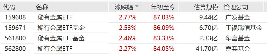 ETF方面,稀有金属ETF、稀有金属ETF基金涨超2%,年内涨幅超80%。