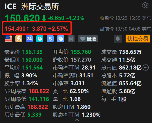 纽约证券交易所母公司洲际交易所(ICE.US)盘前涨2.57%,报154.49美元。消息上,洲际交易所将于美东时间10月30日(今日)盘前发布财报。机构预期洲际交易所2025Q3预计实现营收24.14亿美元,同比增加2.76%;预期每股收益1.285美元,同比增加12.69%。(格隆汇)