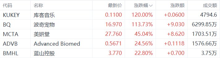 中概股收盘涨幅前五的个股为:库客音乐涨120%,波奇宠物涨113.73%,美妍堂涨45.04%,Advanced Biomed涨25.56%,蓝山控股涨22.8%。(格隆汇)