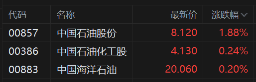 港股三桶油逆势上涨,其中,中国石油股份涨约2%,中国石油化工、中国海洋石油跟涨。