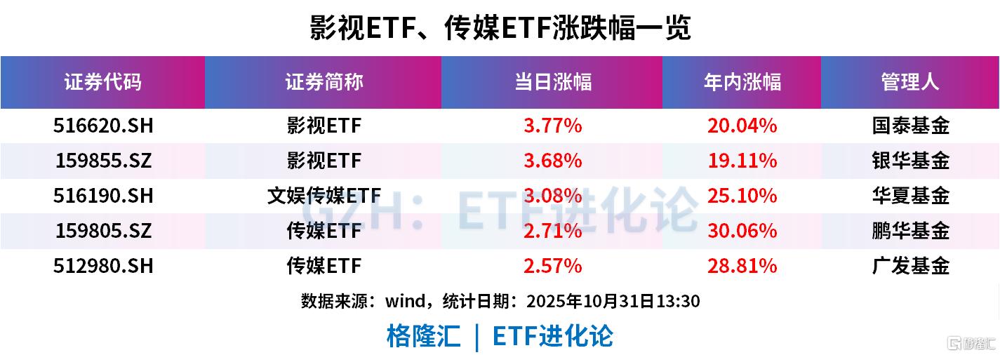 影视院线板块活跃,欢瑞世纪涨停,影视ETF、文娱传媒ETF涨超3%;传媒ETF涨超2%。
