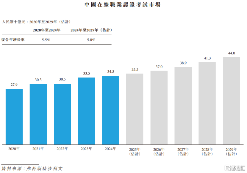 其中,2024年中国在线职业认证考试市场规模为345亿元,随着职业资格考试的申请人数增加,预计到2029年市场规模将达到440亿元,2024年至2029年的复合年增长率为5%,低于2020年至2024年5.5%的复合年增长率。