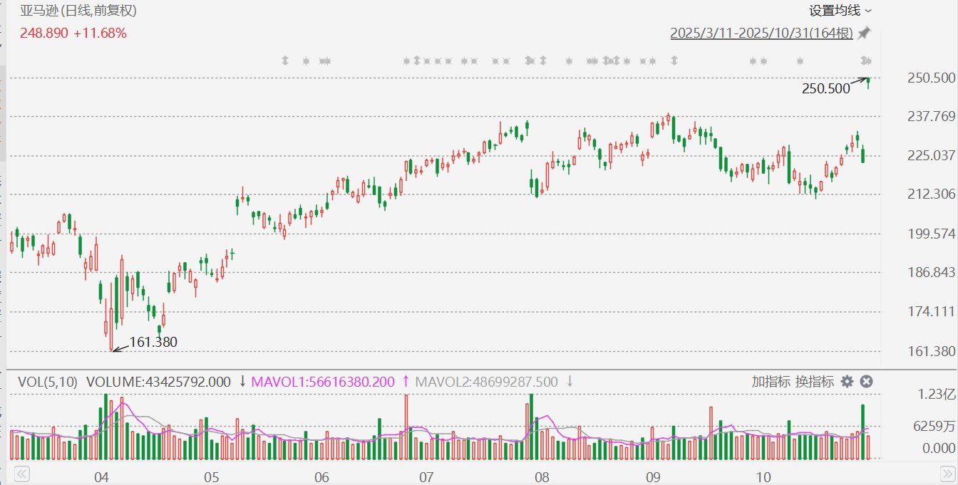 Q3业绩超预期,亚马逊(AMZN.US)盘初大涨超12%报250.5美元,创历史新高,市值骤增近3000亿美元。
