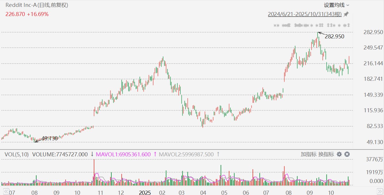 Reddit(RDDT.US)大涨近19%,报230.92美元。消息面上,公司周四公布的第三季度财报远超所有预期。营收同比增长68%至5.85亿美元,每股收益达0.8美元,远超0.51美元的目标。净利润为1.63亿美元,高于去年同期的1.33亿美元,增幅达23%。