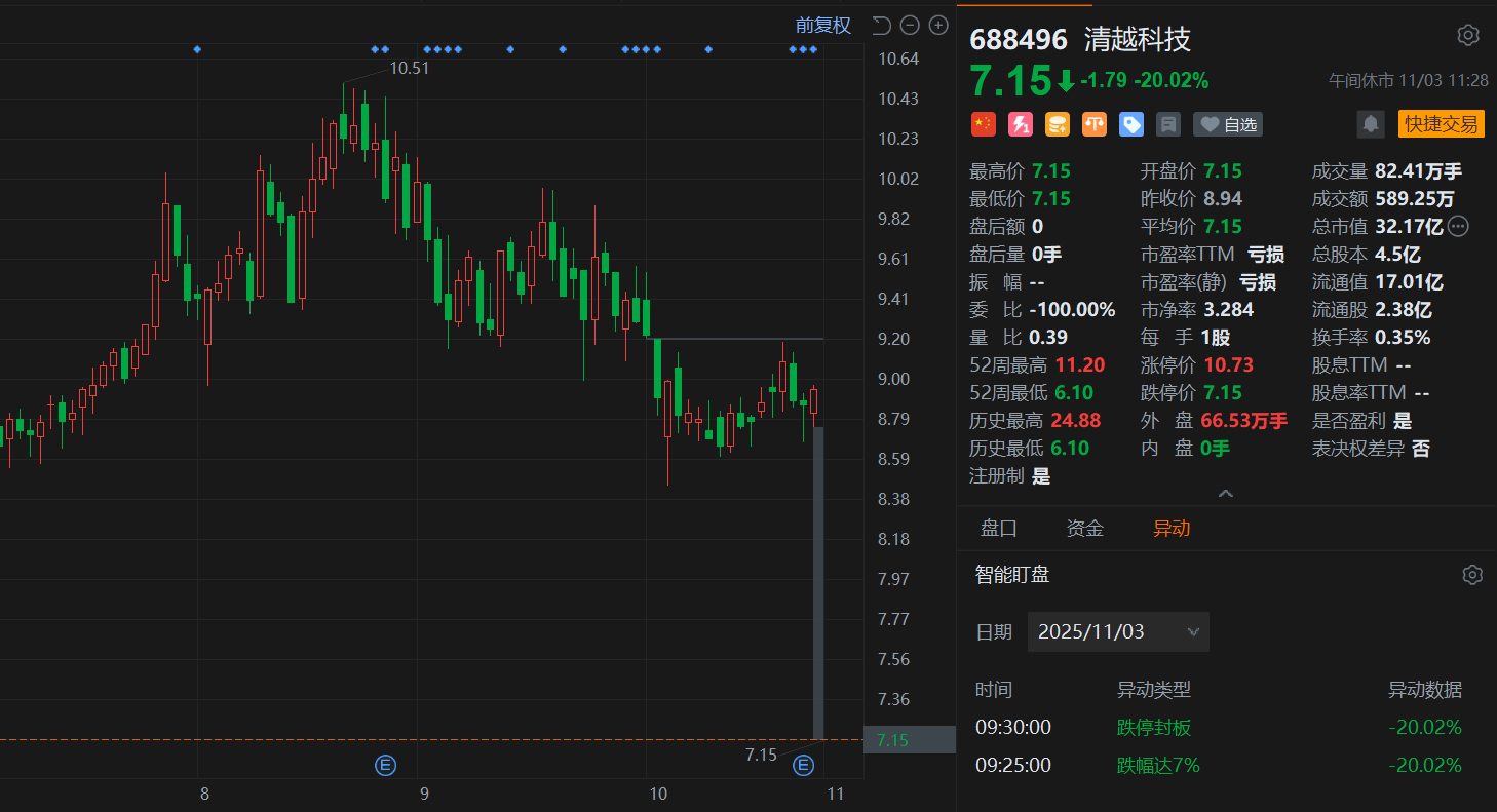 清越科技(688496.SH)一字板跌停,目前封单金额达144亿元,报7.15元创今年4月底以来新低,总市值32.17亿元。