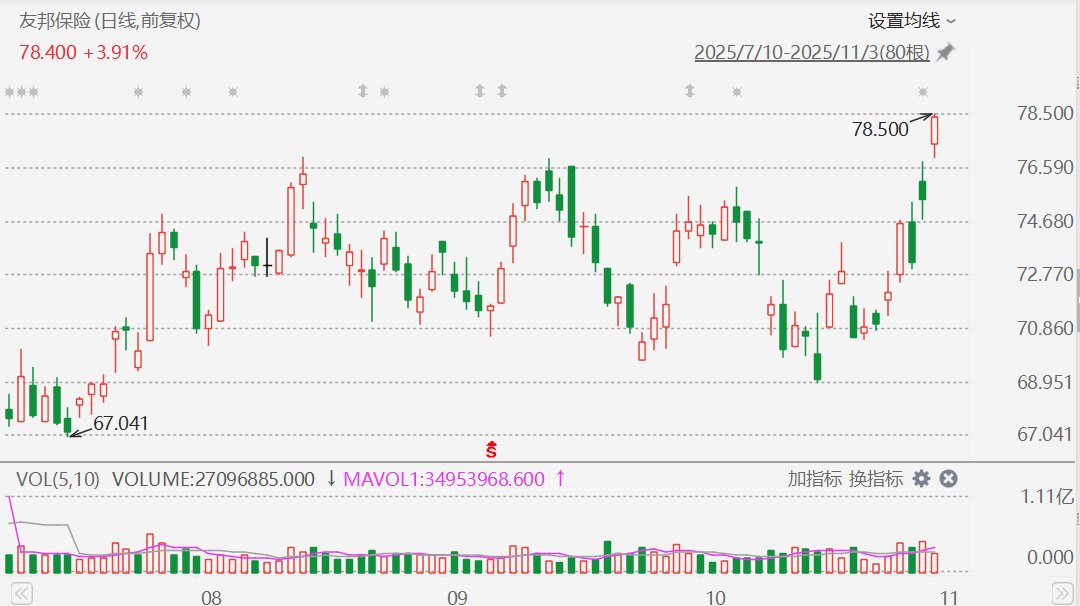 友邦保险(1299.HK)盘中涨4%,报78.5港元,股价创2023年6月以来新高。公司此前公布2025年第三季度业绩显示,按固定汇率计,友邦新业务价值同比升25%至14.8亿美元,创第三季新高,年化新保费增长14%至25.5亿美元。新业务价值利润率受产品组合的有利转变所带动,增加5.7个百分点至58.2%。按新业务保费现值基准呈报的利润率由10%增至11%,而总加权保费收入增加14%至119.10亿美元。