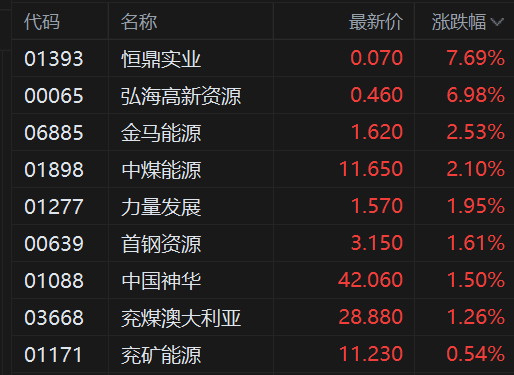 港股煤炭股继续涨势,其中,恒鼎实业涨近8%,中煤能源、金马能源涨超2%,其中中煤能源创2011年以来新高价,力量发展、首钢能源、中国神华、兖煤澳大利亚均涨超1.2%。