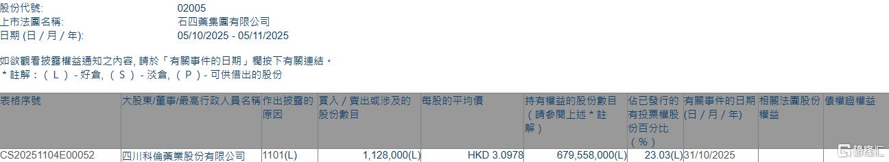 格隆汇11月5日丨根据联交所最新权益披露资料显示,2025年10月31日,石四药集团(02005.HK)获四川科伦药业股份有限公司在场内以每股均价3.0978港元增持112.8万股,涉资约349.43万港元。