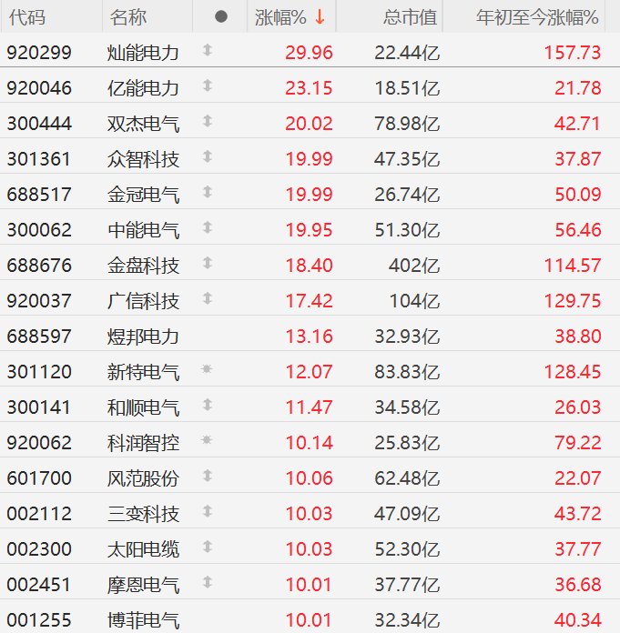 A股市场电网设备股集体爆发,其中,灿能电力30CM涨停,亿能电力涨23%,双杰电气、众智科技、金冠电气、中能电气20CM涨停,金盘科技涨超18%,广信科技涨超17%,煜邦电力涨超13%,新特电气涨12%,和顺电气涨超11%,科润智控涨超10%,风范股份、三变科技、太阳电缆、摩恩电气,、博菲电气、望变电气、宏发股份、神马电力、伊戈尔、三星医疗、保变电气、顺纳股份、新能泰山、10CM涨停。