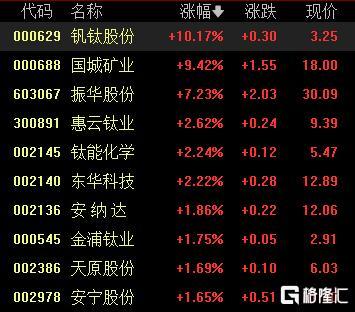 钛白粉概念大涨,钒钛股份涨停,国城矿业涨超9%,振华股份涨超7%,惠云钛业、钛能化学、东华科技等跟涨。