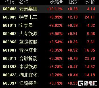 煤炭股走高,安泰集团、特变电工、宝泰隆涨停,大有能源涨超5%,蓝焰控股、晋控煤业、中煤能源等跟涨。