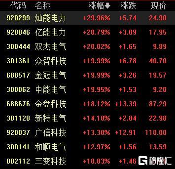 电网设备股大面积涨停,灿能电力30CM涨停,亿能电力涨超20%,双杰电气、众智科技、金冠电气、中能电气20CM涨停,金盘科技涨超18%,新特电气涨超14%。