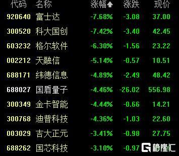 量子科技概念回调,富士达、科大国创跌超7%,格尔软件跌超6%,天融信跌超5%,纬德信息、国盾量子等跟跌。