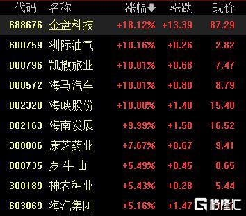 海南、免税店板块强势,金盘科技涨超18%,洲际油气、凯撒旅业、海马汽车、海峡股份、海南发展涨停,康芝药业涨超7%。