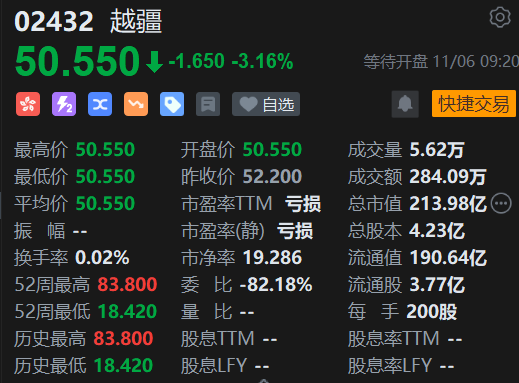 越疆(2432.HK)低开3.16%报50.55港元,最新市值214亿港元。消息上,越疆公布,拟配售1666万股新H股,占扩大后已发行股本约3.79%;每股配售价46.8港元,较昨日收市价52.2港元折让10.34%,集资7.8亿港元。