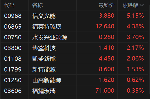 港股光伏股逆势拉升上涨,其中,信义光能涨超5%,福莱特玻璃涨4.38%,协鑫科技、凯盛新能涨超2%,新特能源涨1.5%,山高新能源、福耀玻璃跟涨。