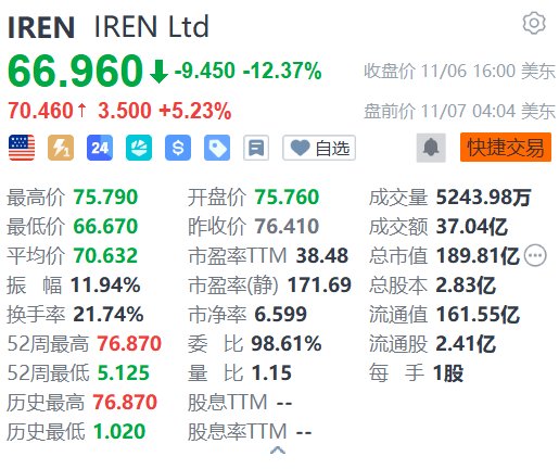 IREN Ltd(IREN.US)盘前涨5.23%报70.46美元。消息面上,IREN Ltd公布截至2025年9月30日的三个月财务业绩,该季度总收入达2.403亿美元,较2025财年第一季度的5280万美元大幅增长355%,高于分析师普遍预期的2.355亿美元;净利润扭亏为盈至3.846亿美元,而上年同期净亏损5170万美元。(格隆汇)