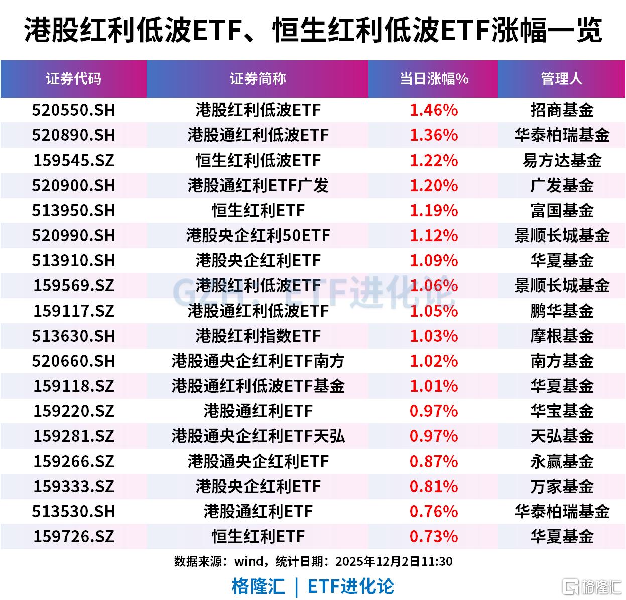 港股红利逆势上涨,港股红利低波ETF、港股通红利低波ETF、恒生红利低波ETF、港股通红利ETF广发、恒生红利ETF、港股央企红利50ETF、港股央企红利ETF、港股红利低波ETF、港股通红利低波ETF、港股红利指数ETF、港股通央企红利ETF南方、港股通红利低波ETF基金涨超1%。