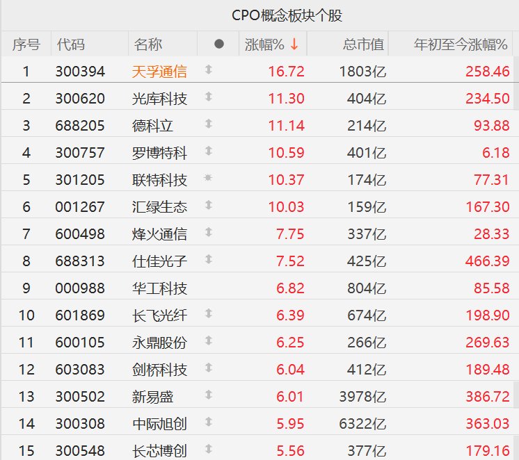 A股市场CPO板块再度全线爆发,其中,天孚通信涨超16%,光库科技、德科立涨超11%,罗博特科、联特科技涨超10%,汇绿生态10CM涨停,仕佳光子、烽火通信涨超7%,华工科技、永鼎股份、新易盛、剑桥科技、长飞光纤涨超6%,中际旭创、长芯博创涨超5%。值得注意的是,天孚通信、仕佳光子、永鼎股份、中际旭创、斯瑞新材创出历史新高。