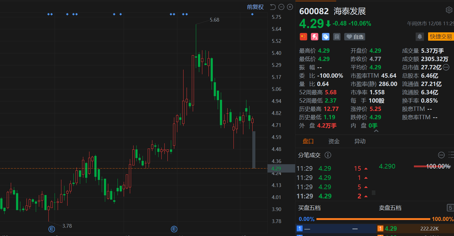 海泰发展(600082.SH)今日一字板跌停,报4.29元创今年10月底以来新低,总市值不足30亿元。消息上,12月5日晚间,海泰发展公告称,因交易双方尚未就交易对价、交易方式等关键交易条款达成一致,公司决定终止以现金方式收购知学云(北京)科技股份有限公司(简称“知学云”)控股权。据悉,作为天津滨海高新区唯一的国有控股上市公司,海泰发展近年来受房地产市场需求变化影响,业绩不尽如人意,净利润已连续多年在1000万元左右徘徊。