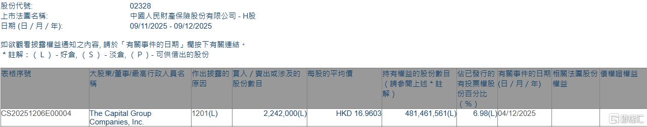 格隆汇12月9日丨根据联交所最新权益披露资料显示,2025年12月4日,中国财险(02328.HK)遭The Capital Group Companies, Inc.在场内以每股均价16.9603港元减持224.2万股,涉资约3802.5万港元。