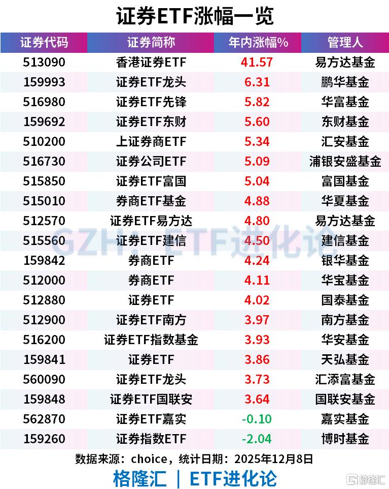 香港证券ETF年内涨超41%,A股证券ETF涨幅在5%。
