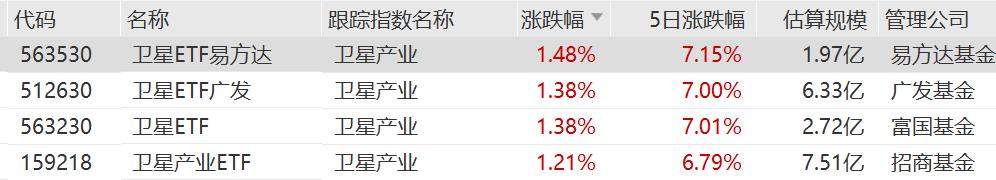 卫星ETF易方达、卫星ETF广发、卫星ETF、、卫星ETF产业涨超1%,近5日涨超7%。